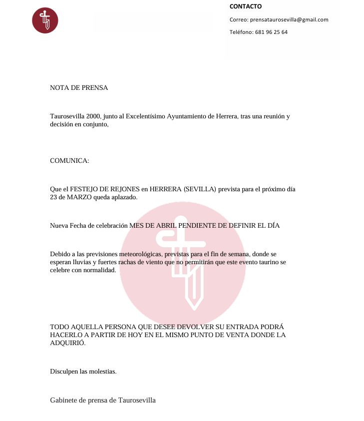El Ayuntamiento de Herrera y Taurosevilla 2000, empresa organizadora del evento, han decidido de manera conjunta aplazar el festejo de rejones que se iba a celebrar el próximo 23 de marzo.