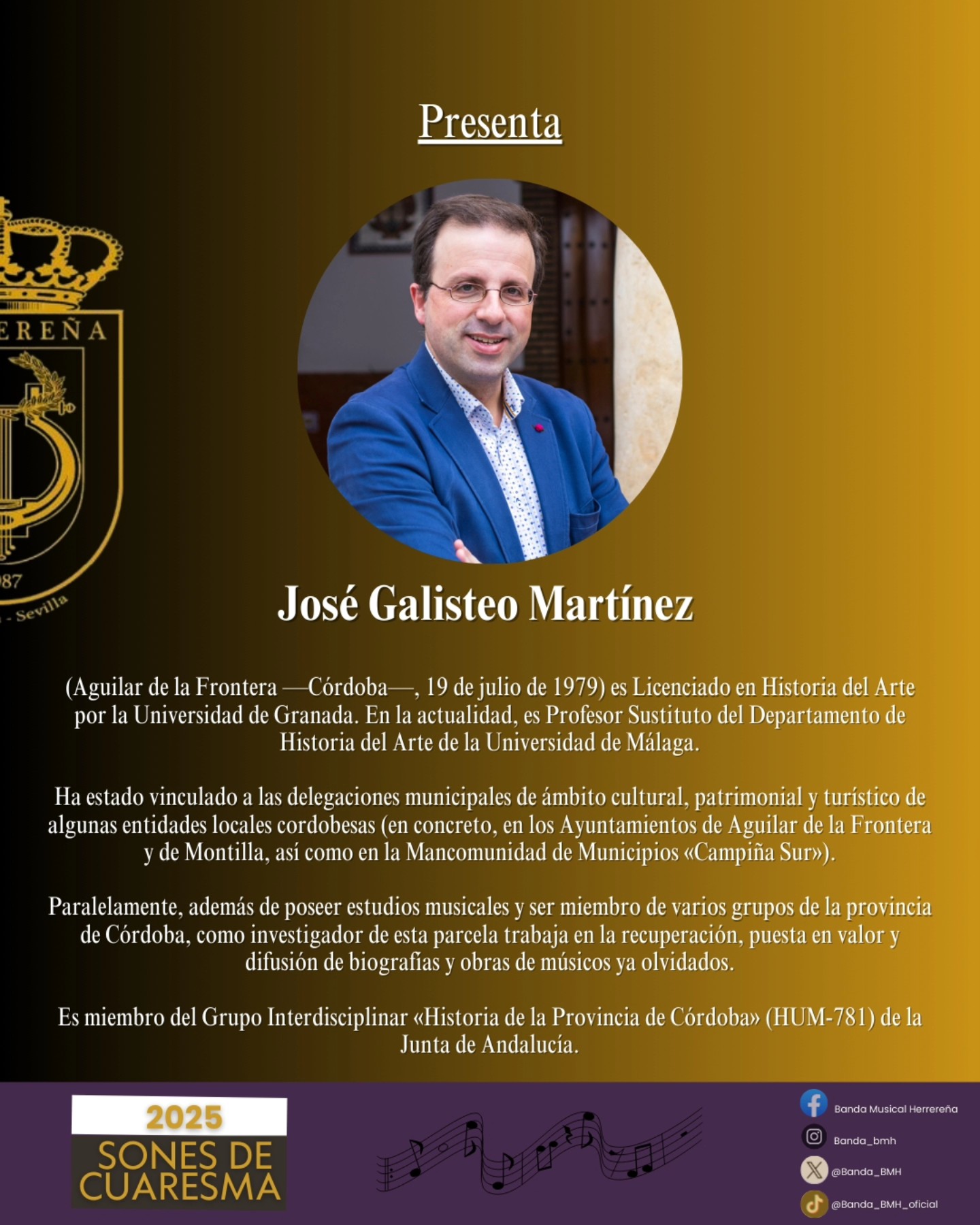 Se trata de un concierto didáctico conducido por José Galisteo Martínez. En esta iniciativa, la Banda Musical Herrereña realizará un repaso histórico por las marchas más significativas del repertorio procesional, desde los inicios del género hasta la actualidad.