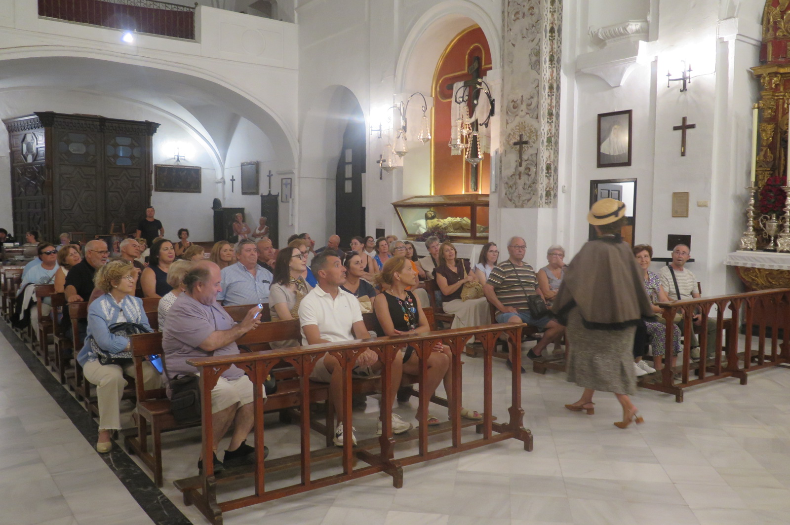 El grupo tuvo la oportunidad de descender a la cripta, espacio cargado de simbolismo y recogimiento; viendo incluso las tres momias que habitan en ese lugar y que se cree que pueden datar de dos siglos. Algunos visitantes subieron después a la torre, contemplando Utrera iluminada desde las alturas.