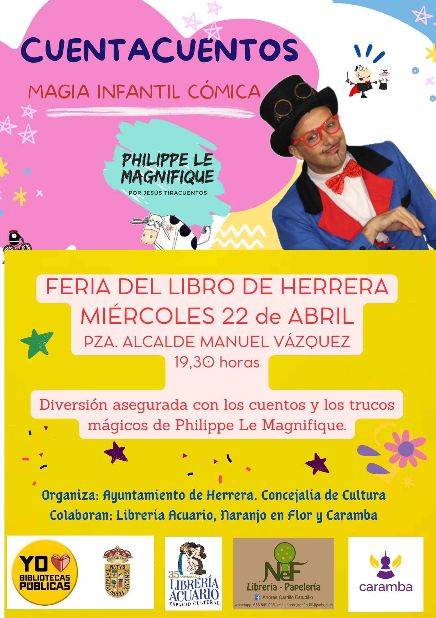 La próxima semana celebramos nuestra tradicional Feria del Libro organizada por la Concejalía de Cultura del Ayuntamiento de Herrera y con la colaboración de las librerías locales Acuario, Caramba y Naranjo en Flor, además del grupo de teatro Escanpolo.