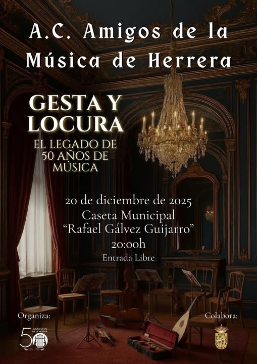 La A.C. Amigos de la Música de Herrera celebra el 50 aniversario de su Banda con un concierto conmemorativo titulado "Gesta y Locura: el legado de 50 años de música", que tendrá lugar el próximo sábado 20 de diciembre, a las 20:00 h, en la Caseta Municipal “Rafael Gálvez Guijarro”, con entrada libre.