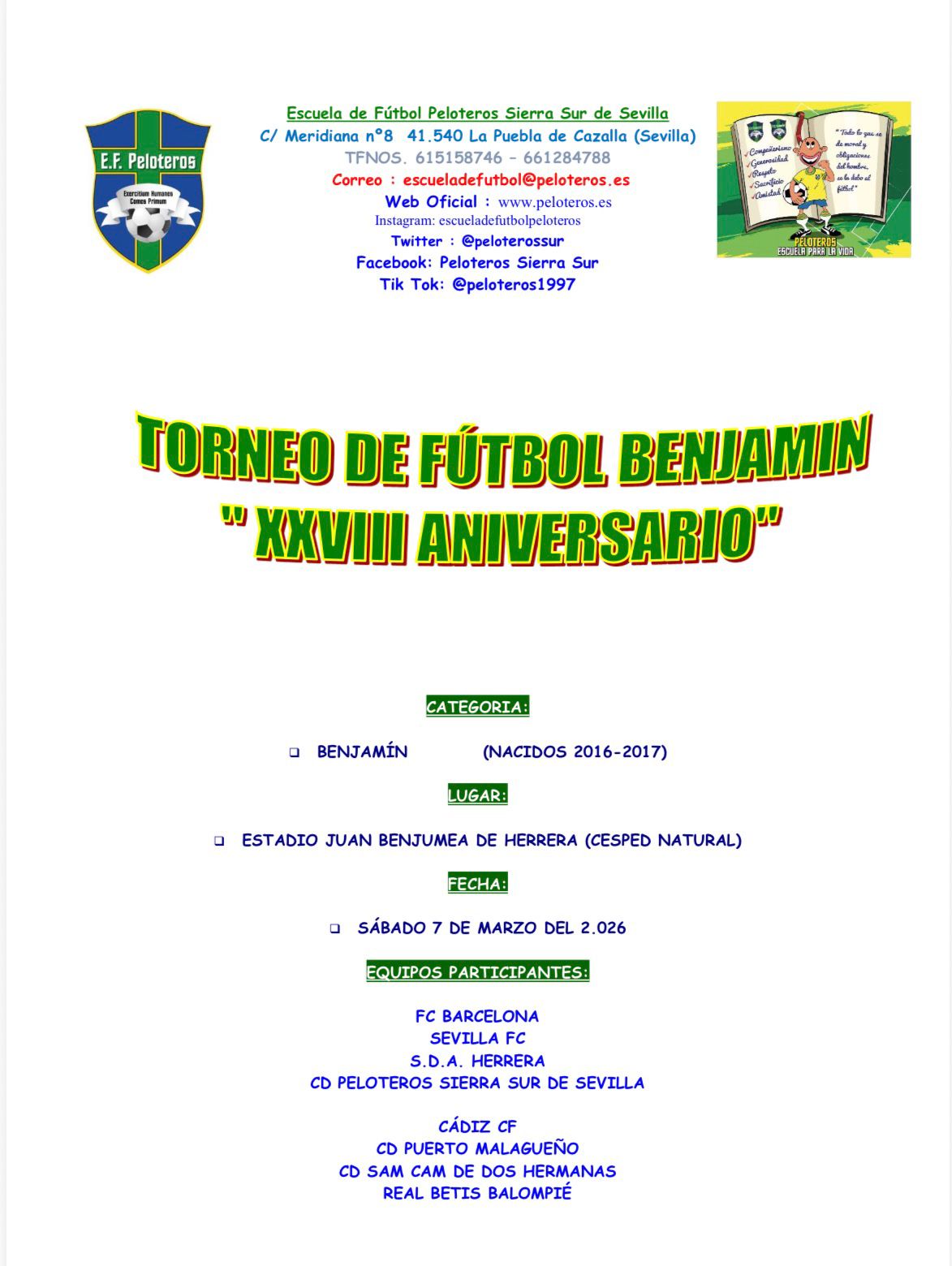 El Estadio Municipal Juan Benjumea de Herrera será escenario el próximo sábado, 7 de marzo, a partir de las 10:30 horas, del Torneo de Fútbol Benjamín XXVIII Aniversario, una cita destacada del fútbol base.