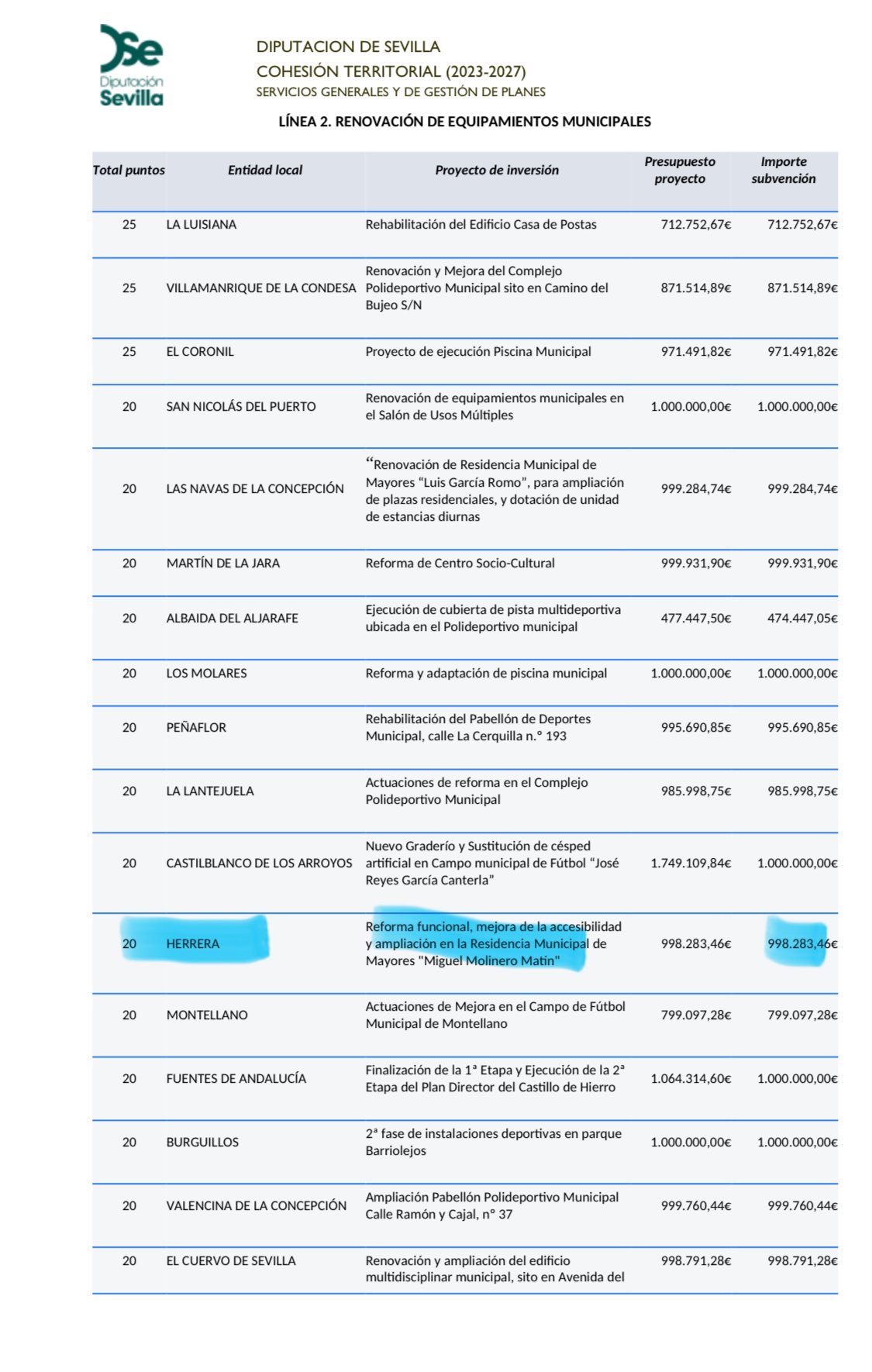 El Ayuntamiento de Herrera ha obtenido una subvención de 1.000.000 € de la Diputación de Sevilla, a través del Fondo Provincial 2030, para llevar a cabo una gran remodelación y ampliación de la Residencia Municipal de Mayores “Miguel Molinero”.