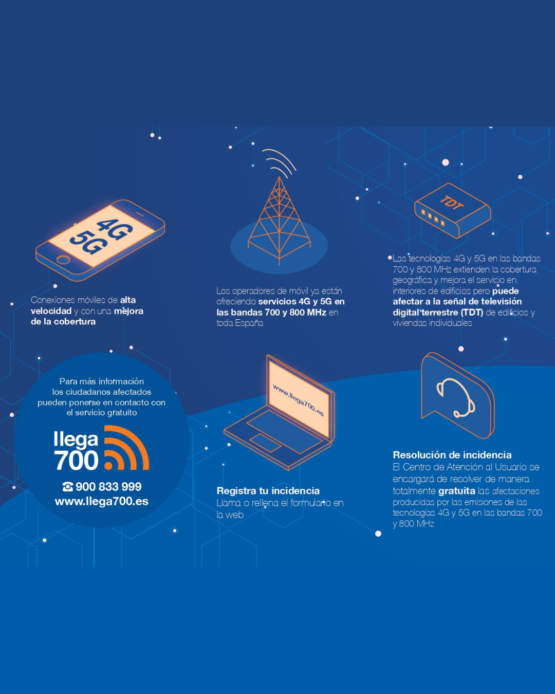 Llega700 se encargará de solucionar cualquier afectación que suceda en la recepción de la TDT motivada por las emisiones de la tecnología móvil de nueva generación en las bandas de 700 y 800MHz para asegurar la continuidad del servicio de TV. Una actuación totalmente gratuita para el usuario.