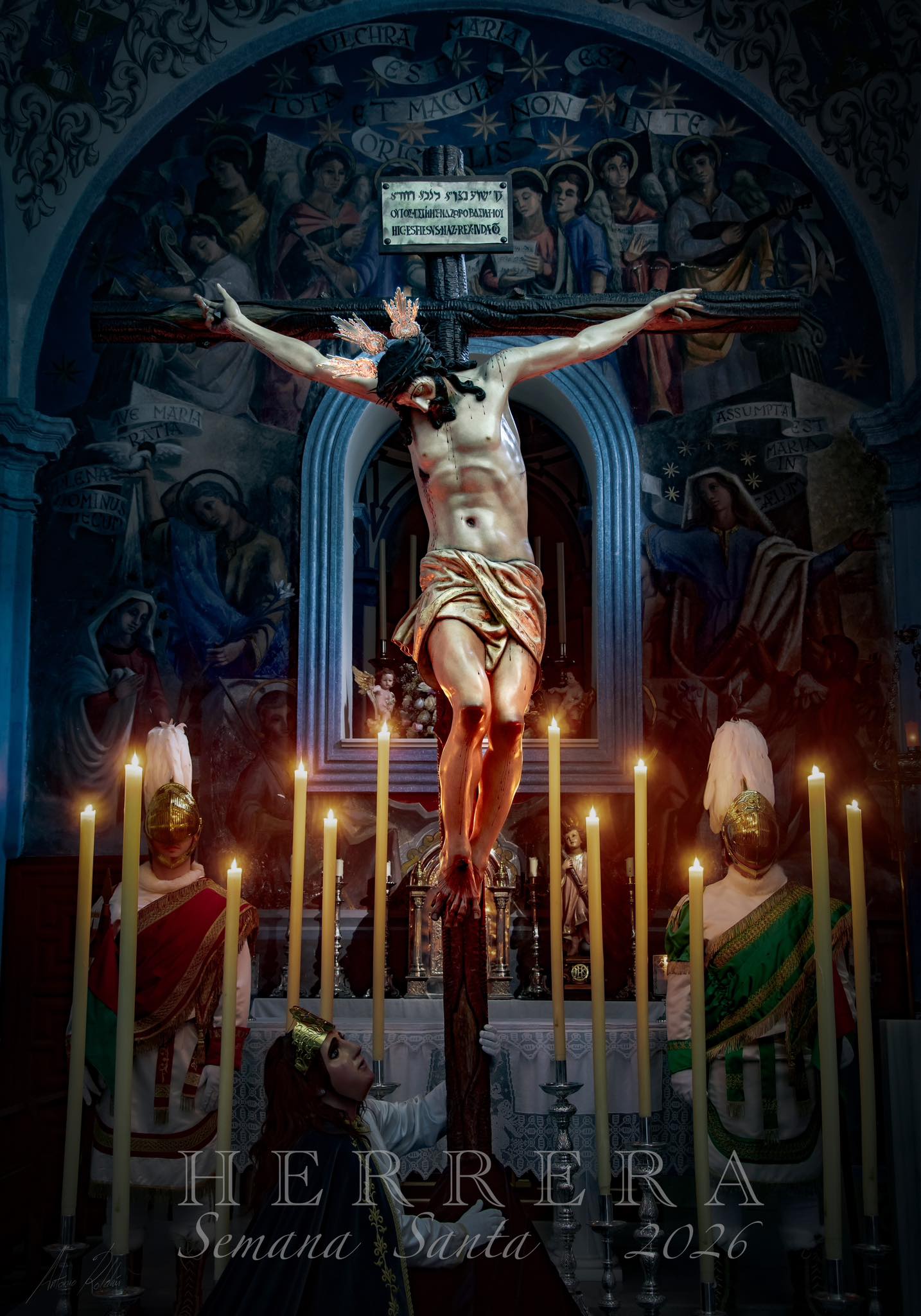 El cartel es obra del herrereño Antonio Roldán Muriel, miembro de la Hermandad del Santísimo Cristo Crucificado. La obra muestra al Santísimo Cristo Crucificado en el altar mayor de la Ermita patronal de la Inmaculada Concepción, recreando un Calvario en el que aparecen dos romanos y María Magdalena al pie de la Cruz. La composición evoca al pueblo de Herrera en la jornada del Sábado Santo, día en el que las tres instituciones realizan estación de penitencia.