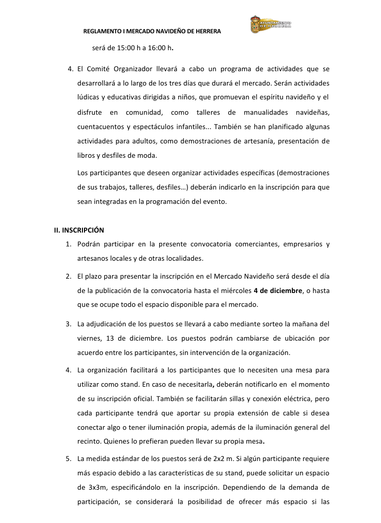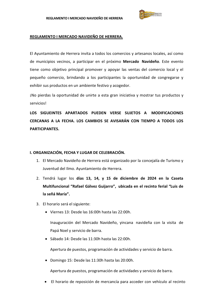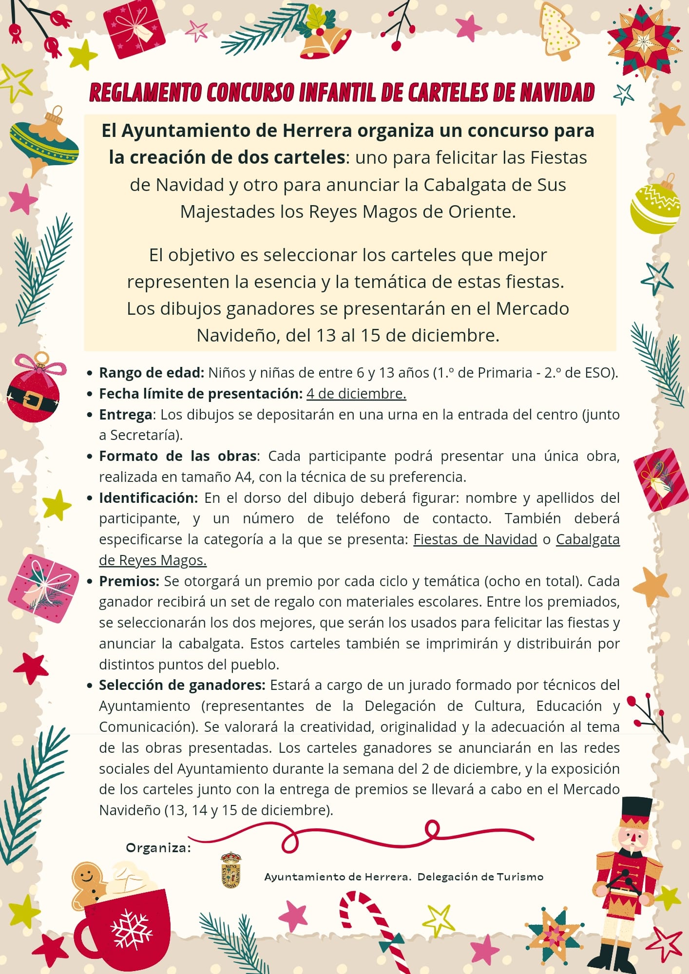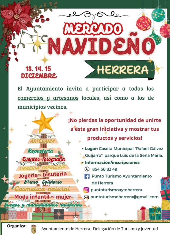 Por otro lado, en el mes de diciembre se celebrará el Mercado Navideño en la Caseta Municipal "Rafael Gálvez Guijarro". Desde el Ayuntamiento de Herrera invitamos a participar a todos los comercios y artesanos locales, así como a los de municipios vecinos.
