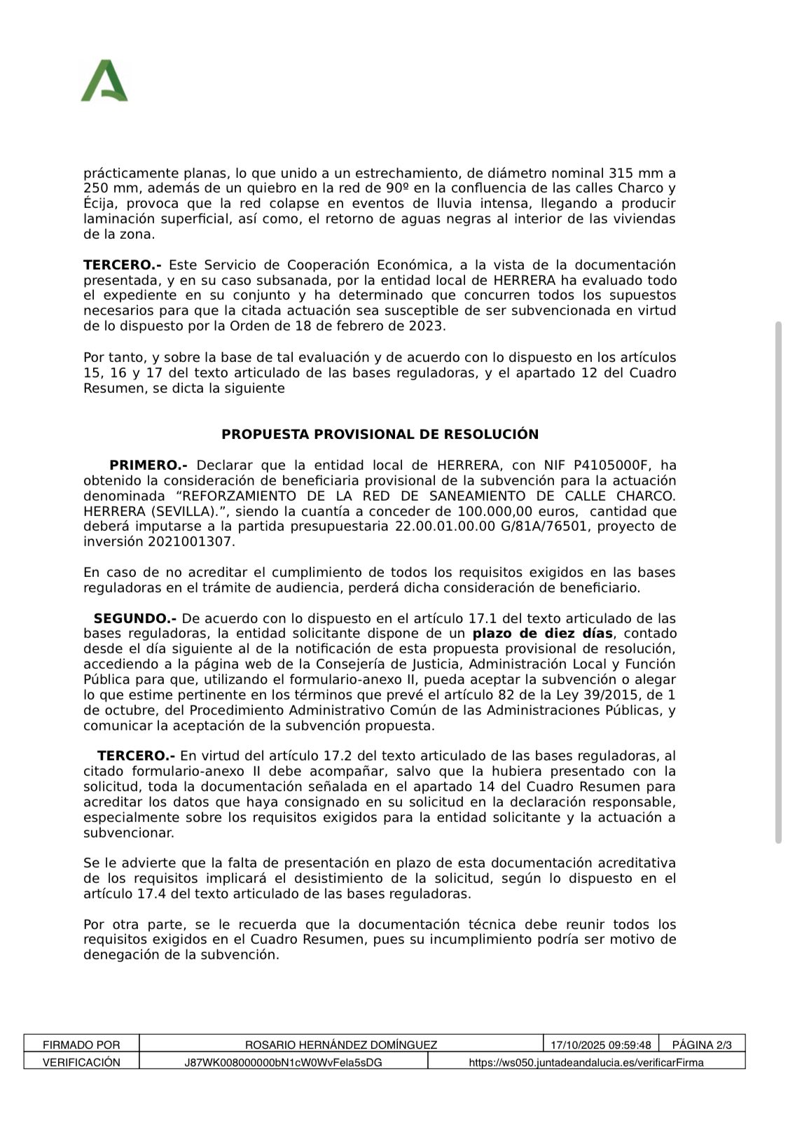 La Consejería de Justicia, Administración Local y Función Pública de la Junta de Andalucía ha concedido al Ayuntamiento de Herrera una subvención de 100.000€ en el marco del Plan de Cooperación Municipal.