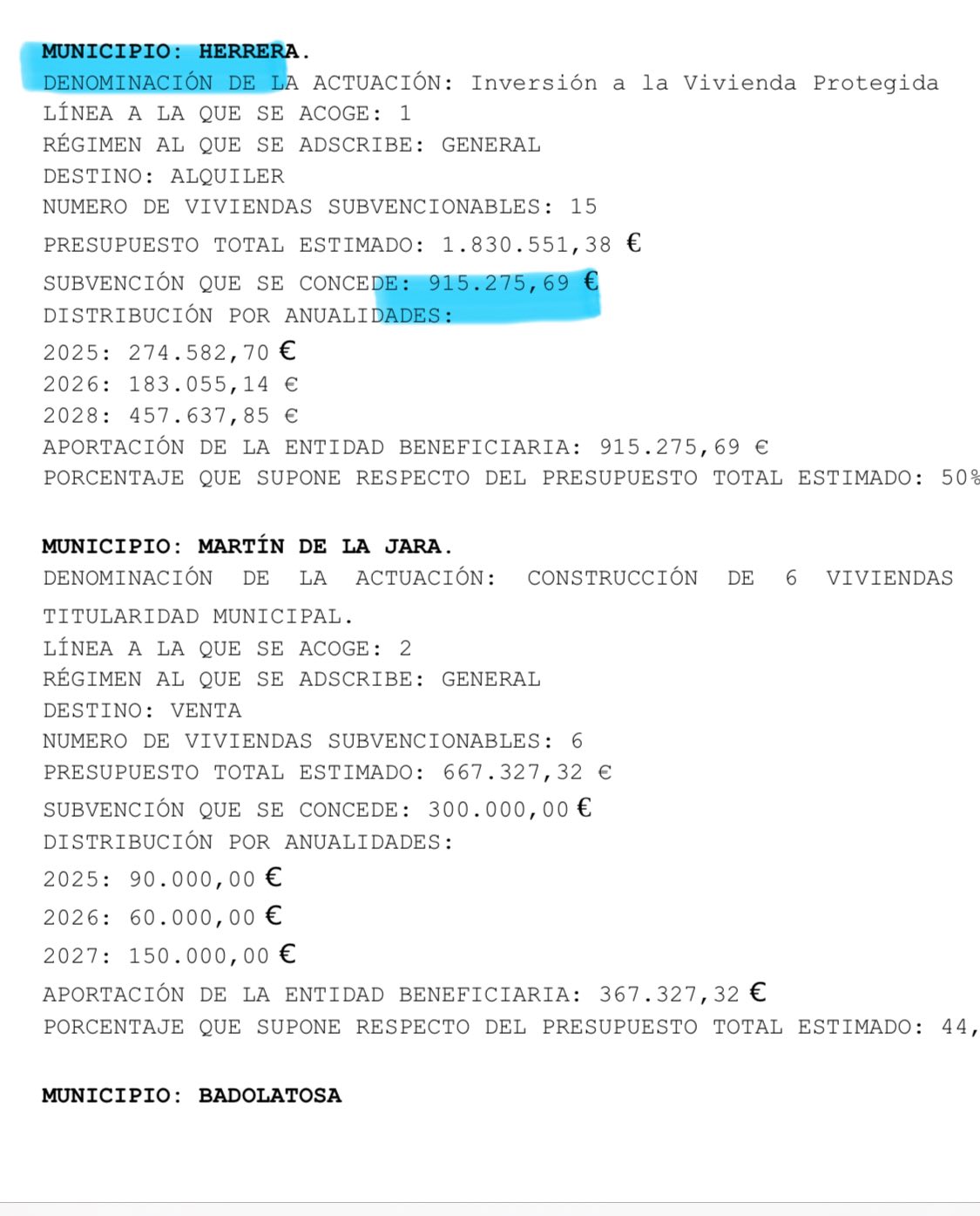 El Ayuntamiento de Herrera ha conseguido cerca de un millón de euros para la construcción de 15 nuevas viviendas de protección oficial (VPO) en régimen de alquiler. Estas viviendas se ubicarán en la zona de Eras Sur, frente al patio de la Residencia Municipal de Mayores “Miguel Molinero Martín”.