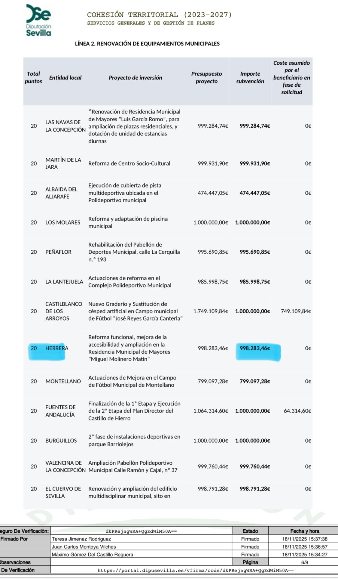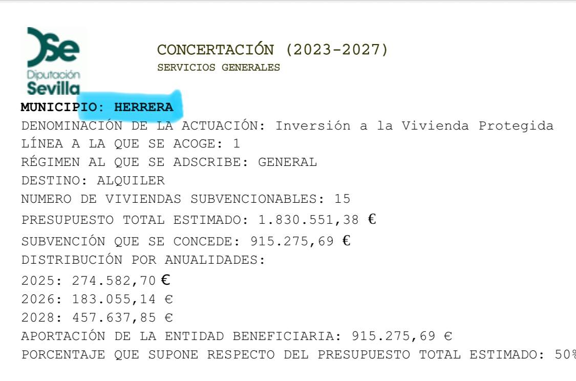 La Diputación de Sevilla ha notificado al Ayuntamiento de Herrera que consigue dos grandes inversiones destinadas a dos áreas importantes: la vivienda pública y el cuidado de nuestros mayores.