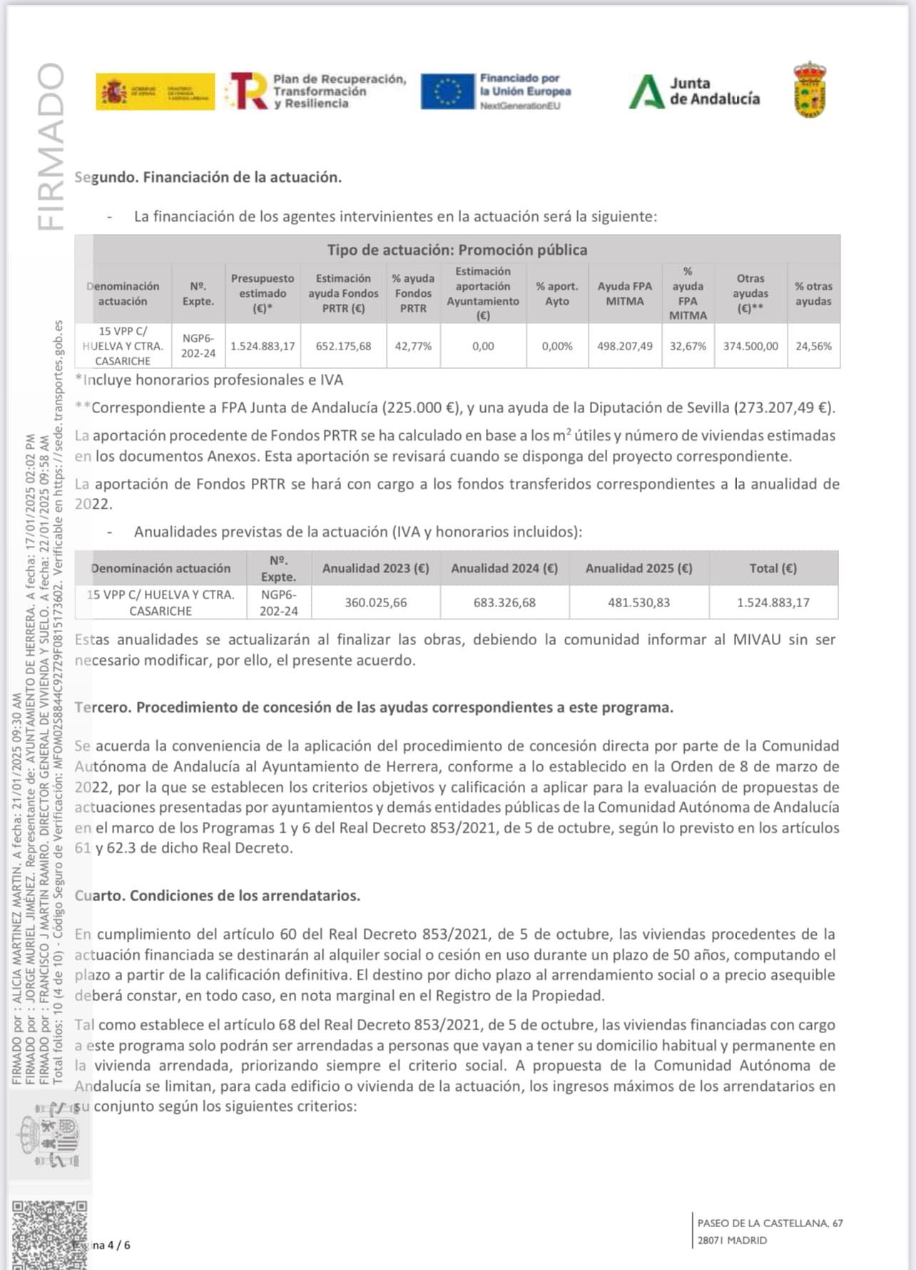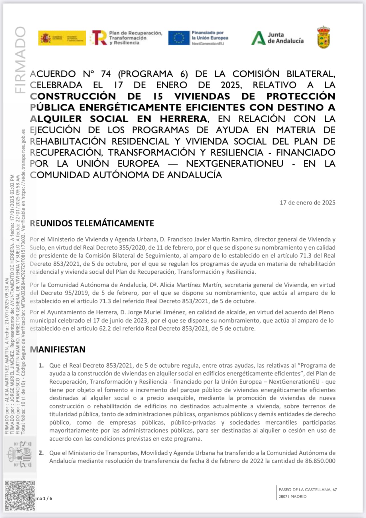 Esta contribución se enmarca en el acuerdo nº74 (Programa 6) de la comisión bilateral, celebrada el 17 de enero de 2025, relativo a la construcción de 15 viviendas de protección pública energéticamente eficientes con destino a alquiler social en Herrera, en relación con la ejecución de los programas de ayuda en materia de rehabilitación residencial y vivienda social del Plan de Recuperación, Transformación y Resiliencia -financiado por la Unión Europea—NextGenerationEU – en la Comunidad Autónoma de Andalucía.