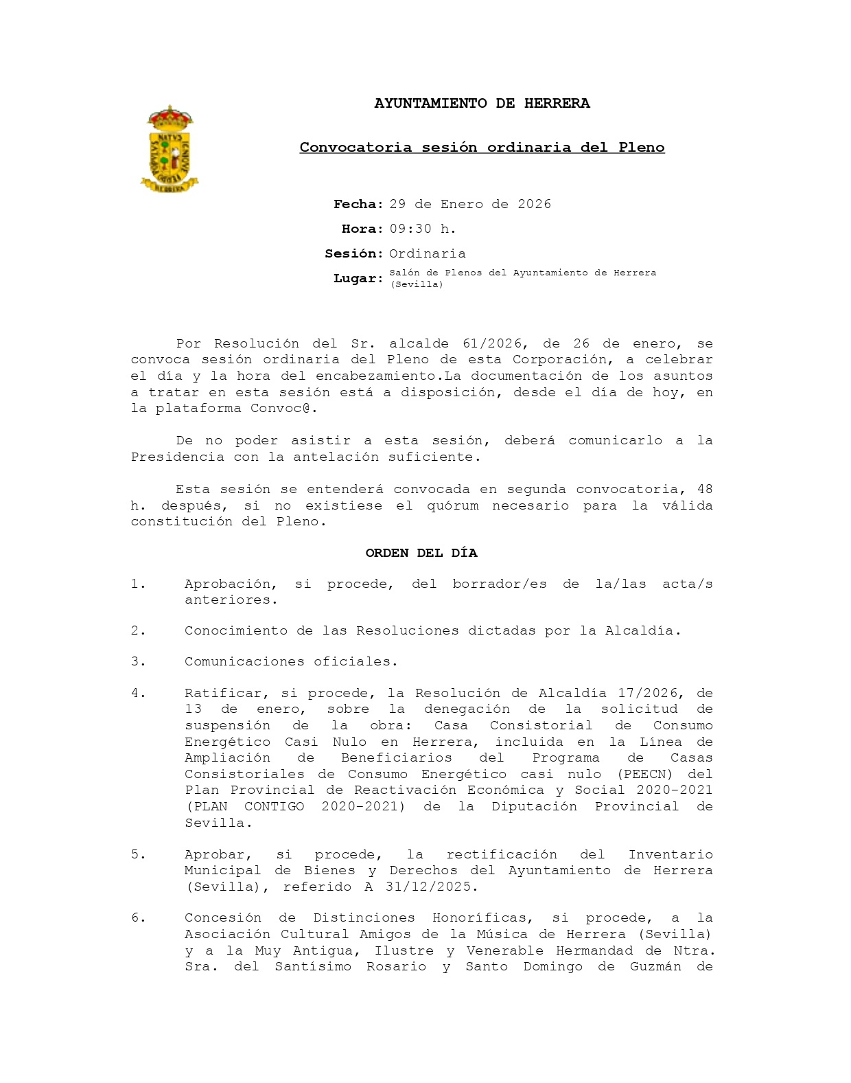 Convocatoria sesión ordinaria del Pleno (29/01/2026).