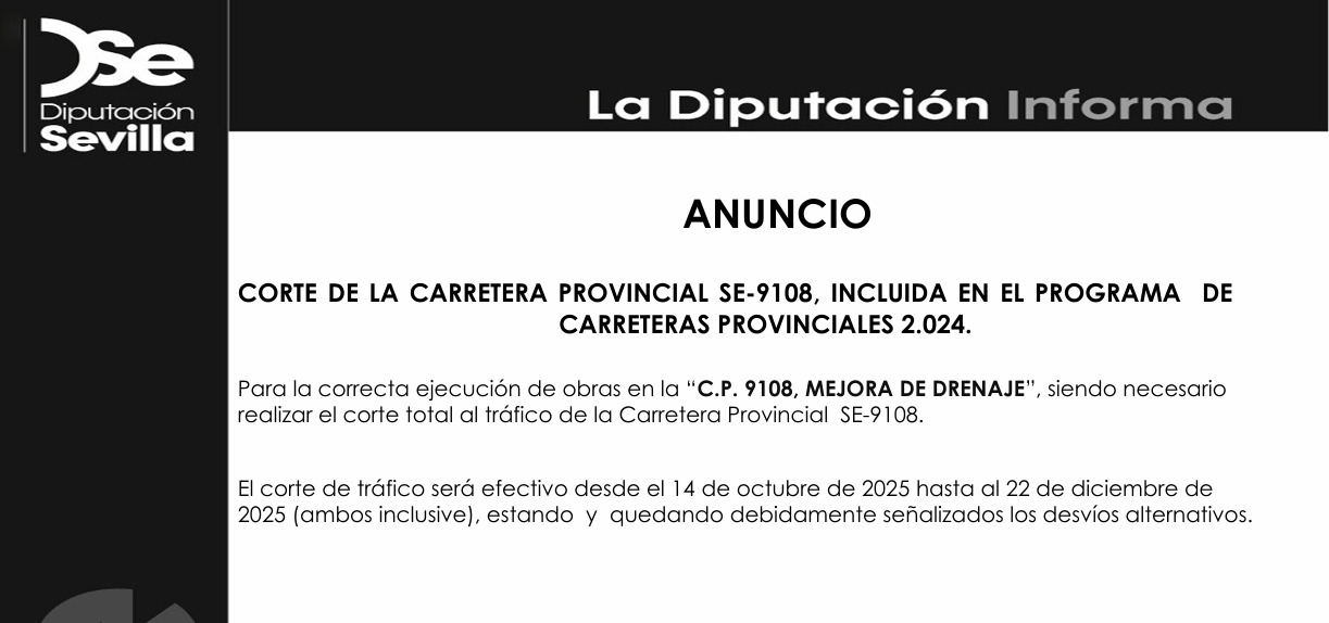 El Ayuntamiento de Herrera informa que, desde hoy, 14 de octubre, hasta el 22 de diciembre, ambos inclusive, estará cortada al tráfico la carretera provincial SE-9108 Écija-Herrera a la altura de Isla Redonda para la correcta ejecución del proyecto “CP SE-9108, MEJORA DE DRENAJE”. En el tramo entre Herrera e Isla Redonda se podrá circular con normalidad.