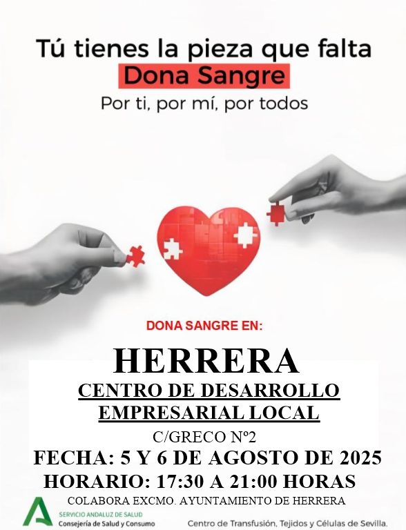 Los herrereños que deseen donar sangre podrán hacerlo el próximo martes y miércoles en horario de 17:30-21:00 horas en el Centro de Desarrollo Empresarial Local, ubicado en calle El Greco s/n.