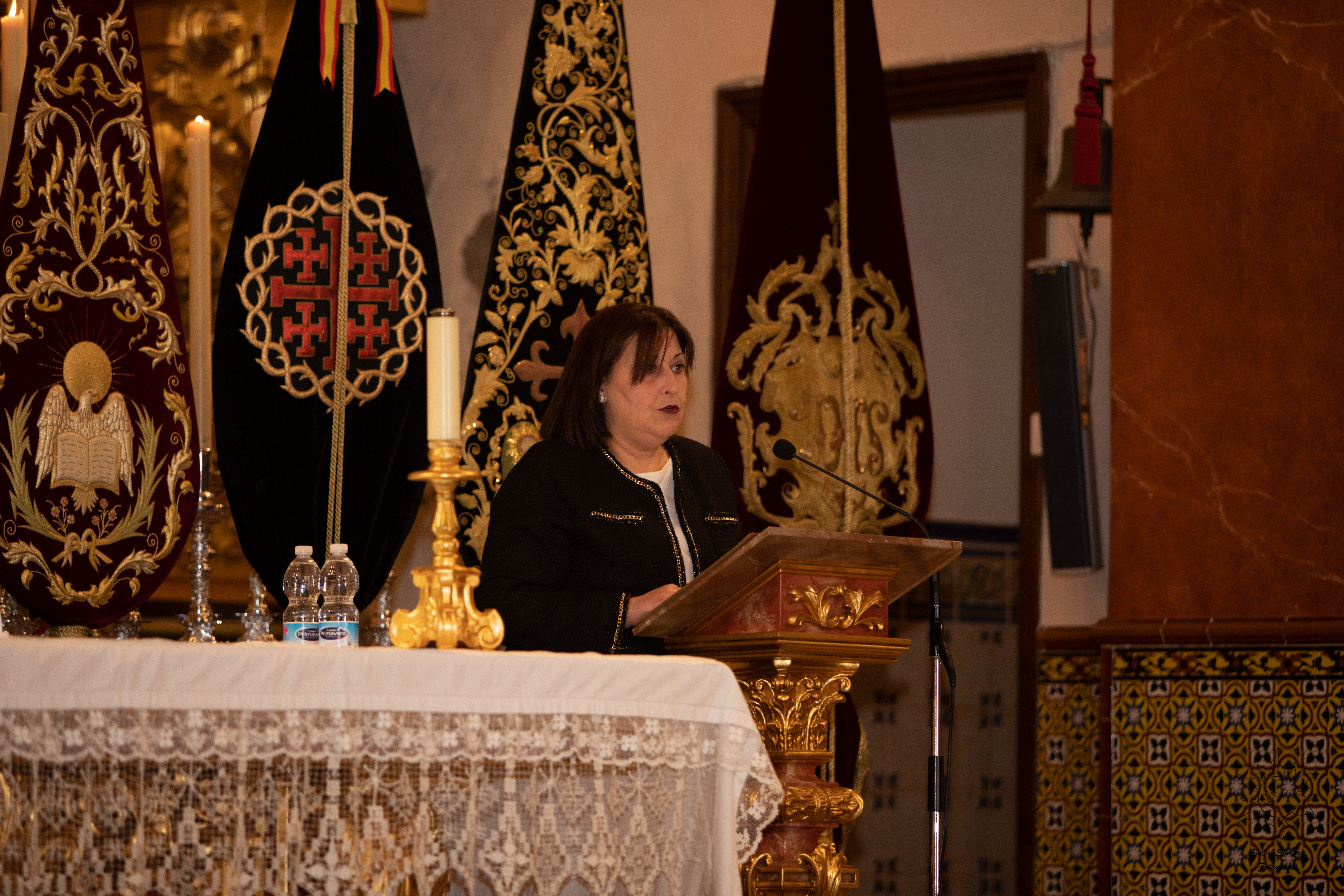 Ana María Canela, en nombre del Consejo general de Hermandades y Corporaciones, se dirigió al público asistente a la Parroquia, y a quienes siguieron el pregón a través de las tres televisiones locales. Posteriormente dio paso a Esperanza Rojas, presentadora del pregonero. Ella fue la encargada de describir con acierto y especial cariño, la trayectoria de José Antonio Jurado Muriel.
