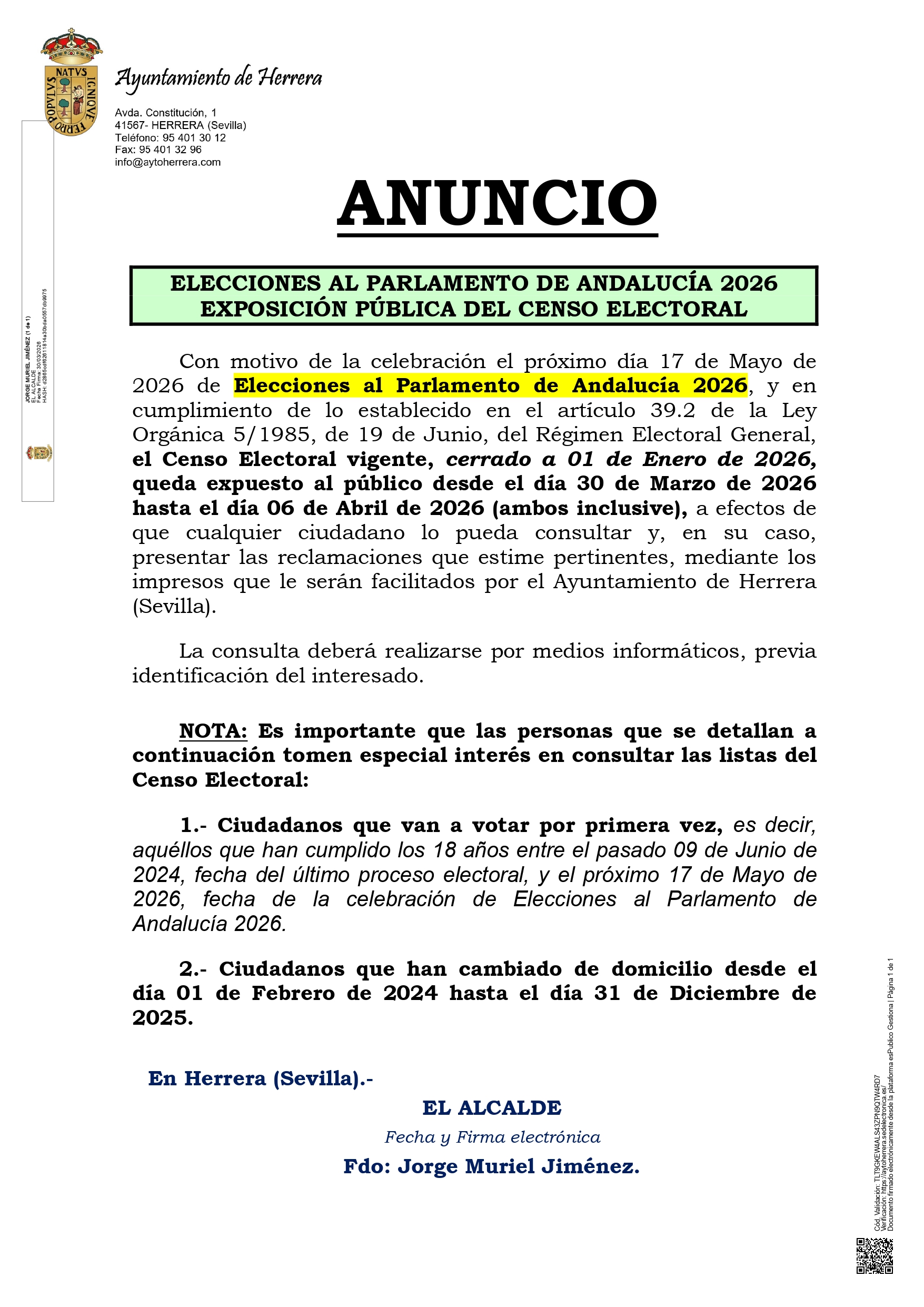 EXPOSICIÓN PÚBLICA DEL CENSO ELECTORAL PARA LAS ELECCIONES AL PARLAMENTO DE ANDALUCÍA 2026