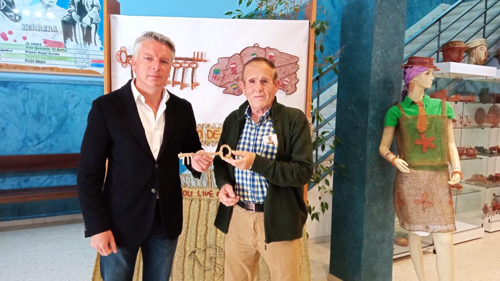 En el acto de presentación el artista granadino ha estado acompañado por el primer teniente de alcalde, Alejandro Suárez. Minutos después ha llegado el alcalde, quien ha recibido de manos de este vecino de La Malahá (Granada) una llave realizada con esparto y con el nombre de Herrera en hilo de cobre.