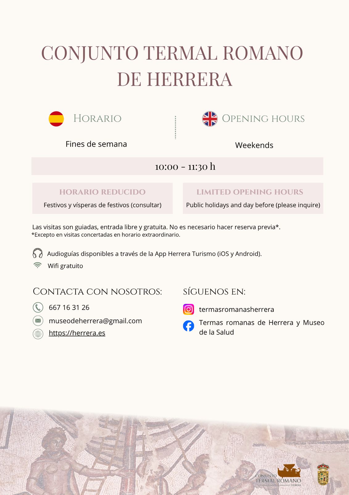 Con motivo de la Semana Santa, el Conjunto Termal Romano de Herrera y el Museo de la Higiene y la Salud en la Historia modifican sus horarios de apertura.