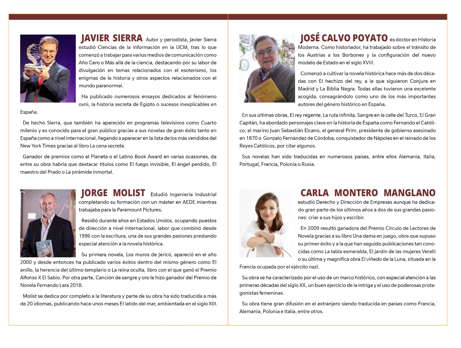 Los escritores Javier Sierra, Jorge Molist, Carla Montero y el también coordinador José Calvo Poyato se darán cita en Herrera para impartir diferentes conferencias y hablar de sus novelas.