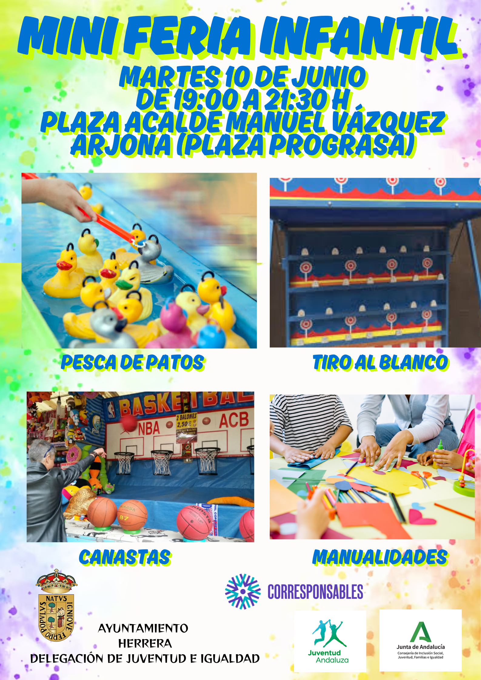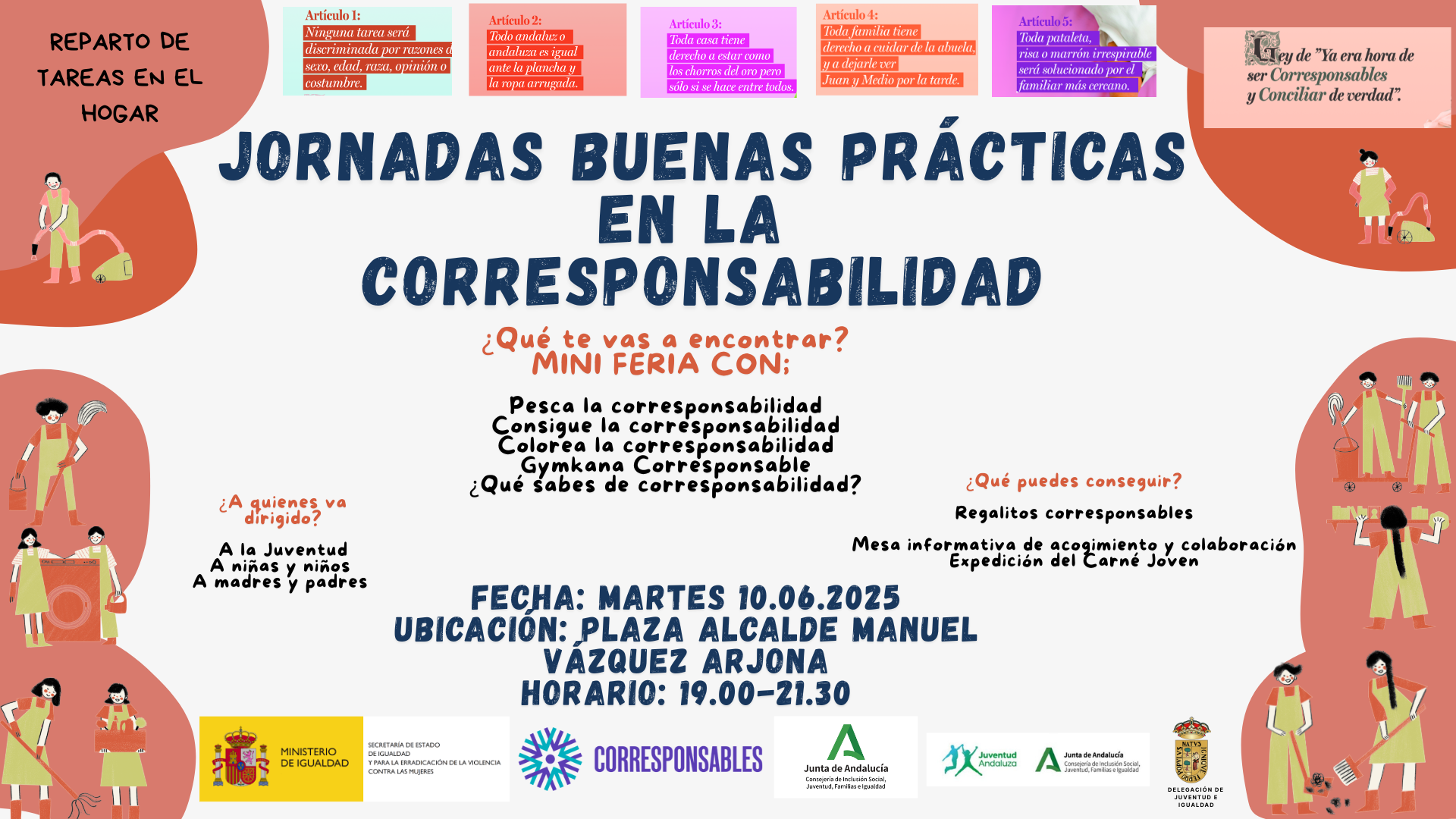 Las Delegaciones de Juventud e Igualdad del Ayuntamiento de Herrera, en colaboración con la Delegación Territorial de Inclusión Social, Juventud, Familias e Igualdad de la Junta de Andalucía, llevarán a cabo el martes, 10 de junio, en la Plaza Alcalde Manuel Vázquez Arjona, las Jornadas “Buenas Prácticas en la Corresponsabilidad” y una Mini feria Infantil en horario de 19:00 a 21:30 horas.