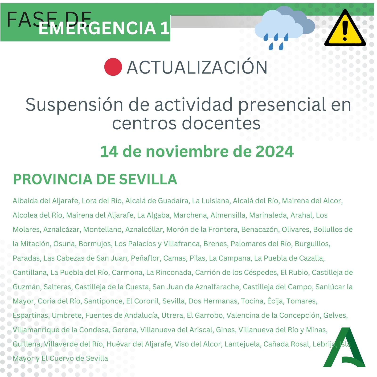 La Agencia Estatal de Meteorología (AEMET) ha activado el aviso amarillo por fuertes lluvias en la comarca de la Sierra Sur de Sevilla para mañana jueves, 14 de noviembre, desde las 00:00 hasta las 07:59 horas. Varios centros educativos de la provincia suspenden las clases, pero NO ES EL CASO DE HERRERA. En Herrera los centros educativos funcionarán con normalidad.