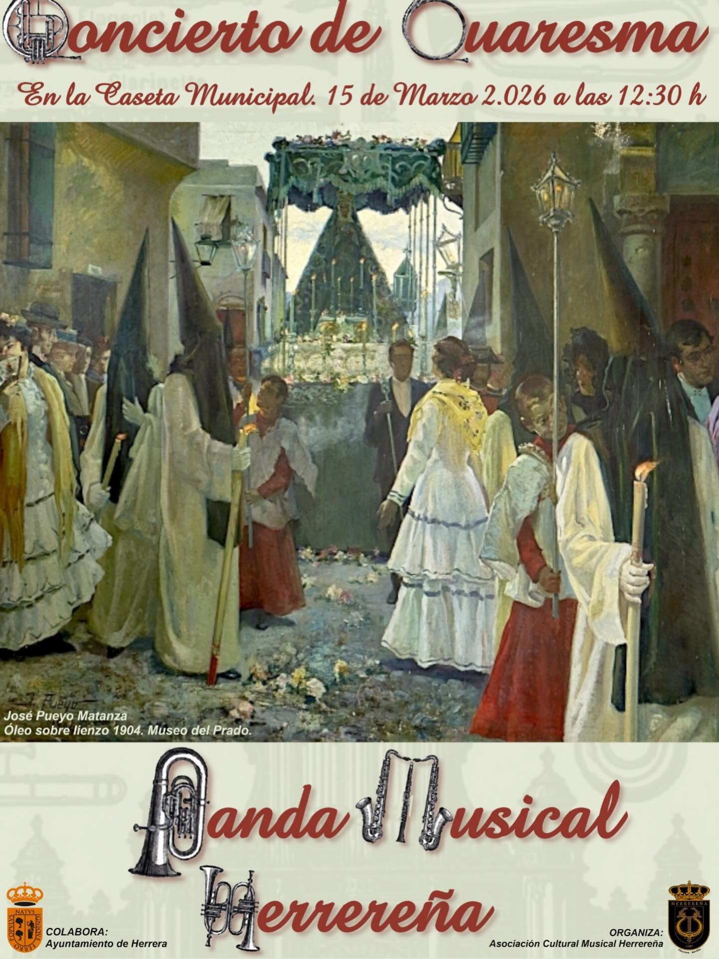 El próximo domingo, 15 de marzo, la Banda Musical Herrereña ofrecerá su tradicional Concierto de Cuaresma, dentro de la programación de las III Jornadas Cofrades. El evento tendrá lugar en la Caseta Municipal “Rafael Gálvez Guijarro” a partir de las 12:30 horas.