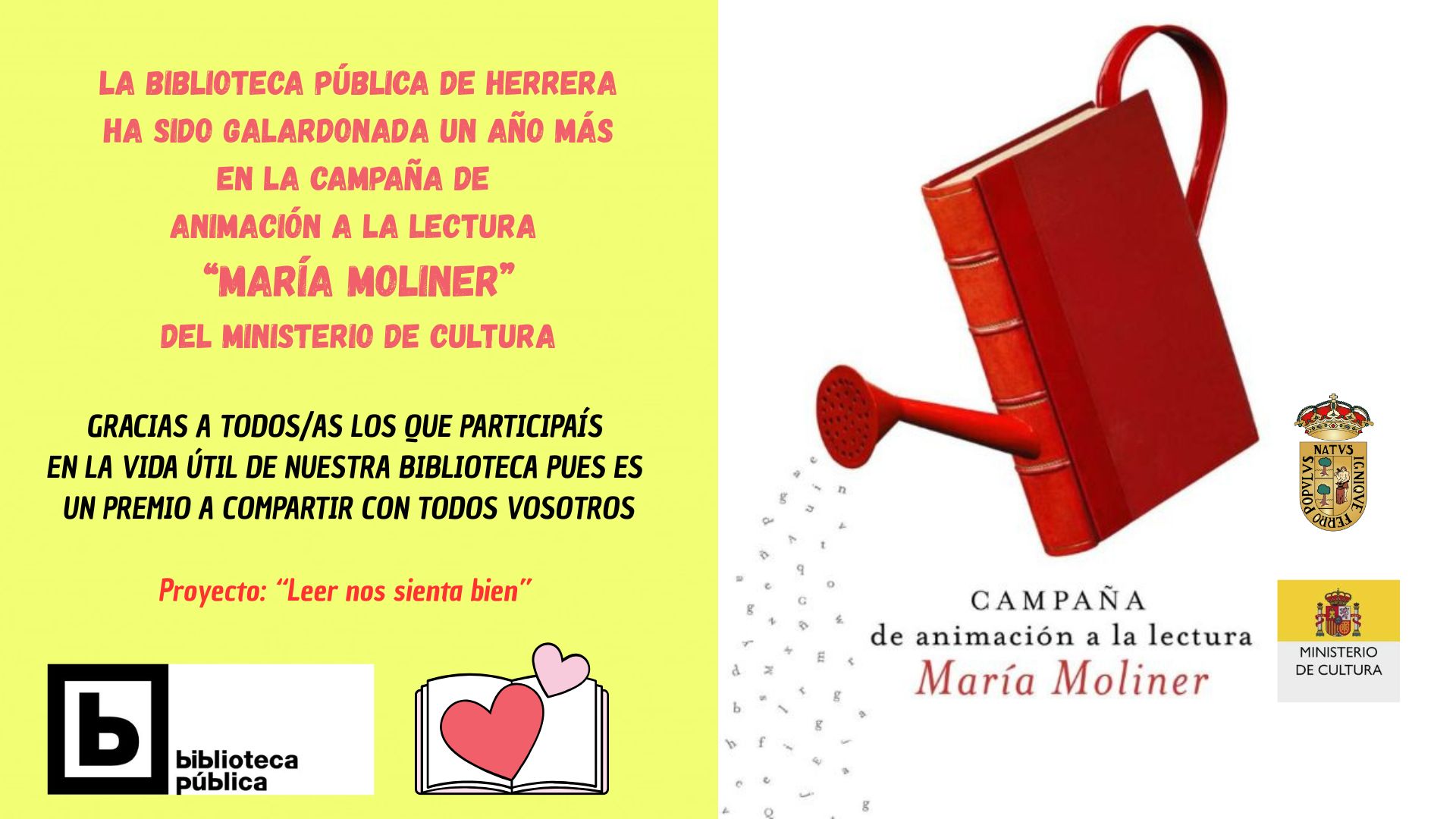 Desde el Ayuntamiento de Herrera trasladamos a todos los vecinos que el Ministerio de Cultura ha concedido a nuestra Biblioteca Municipal un nuevo Premio María Moliner por su proyecto "Leer nos sienta bien".