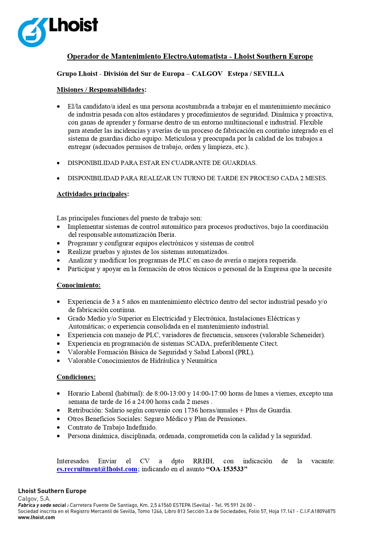 - Operador/a de mantenimiento electroautomatista en Estepa (Grupo Lhoist).
