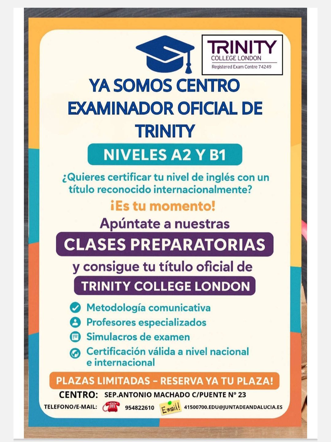El lunes, 2 de junio, se abre el periodo de matriculación en los diferentes cursos que ofrece el SEP “Antonio Machado”, de Herrera. Puedes inscribirte hasta el lunes, 16 de junio. ¡Ahora somos centro examinador oficial de Trinity!