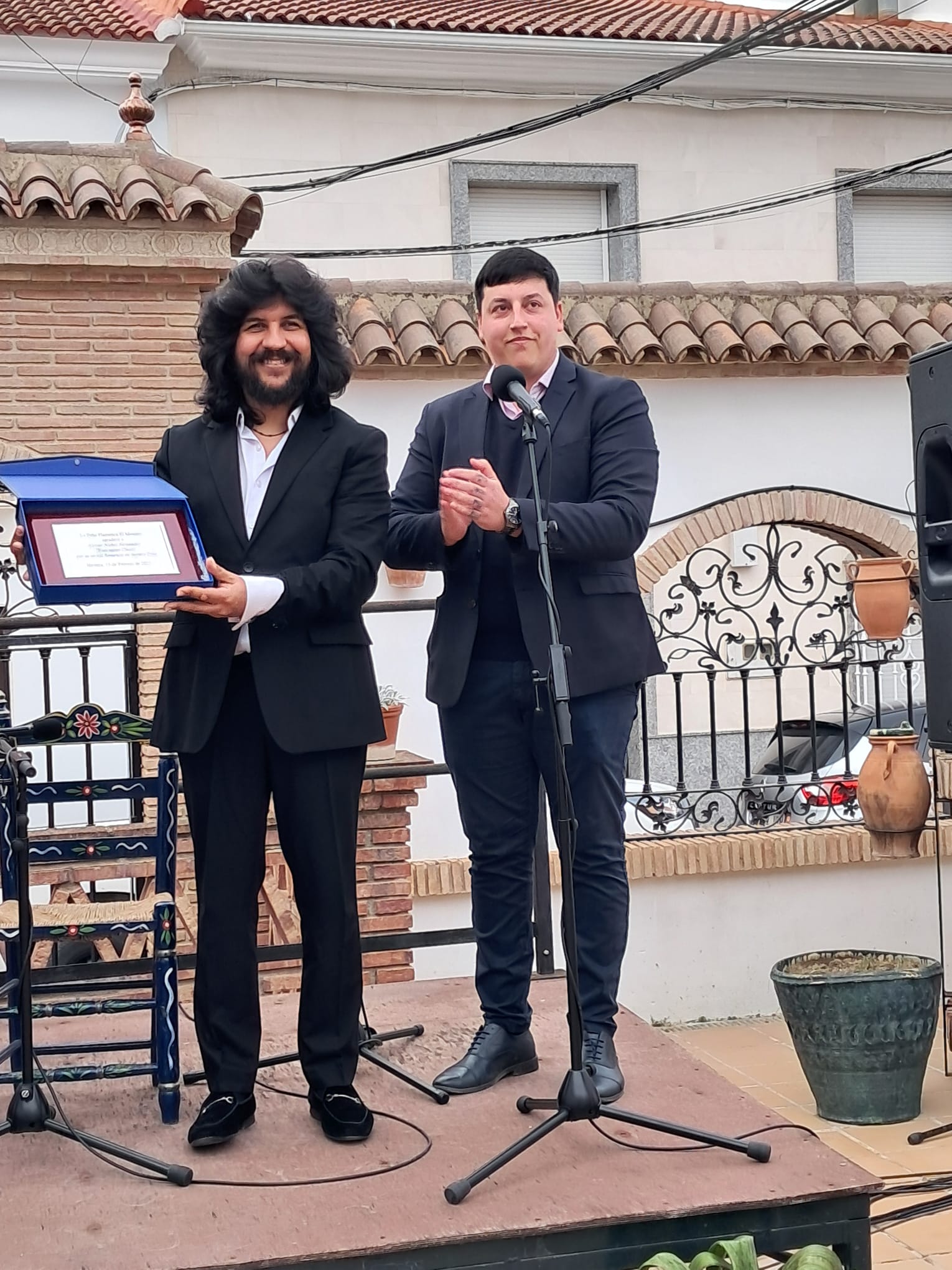 Tras un descanso, el concejal de Cultura, Cristian Manuel Cáceres, y el presidente de la Peña Flamenca, Manuel Cabrera, hicieron entrega de una placa de recuerdo al artista como homenaje a su trayectoria musical.