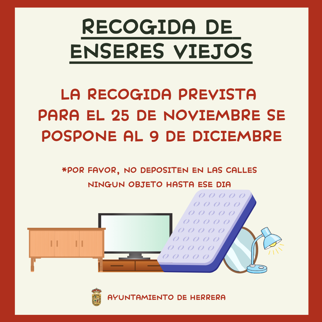 El Ayuntamiento de Herrera informa a todos los vecinos que la próxima recogida de enseres viejos prevista para el 25 de junio se pospone al 1 de julio.