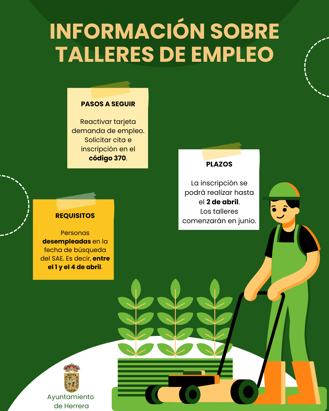 - Los talleres serán de limpieza en edificios públicos y jardinería.