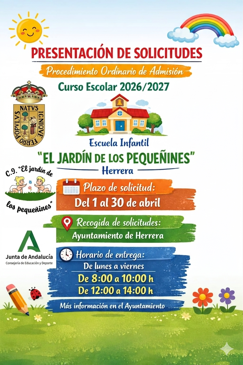 El Ayuntamiento de Herrera abre el periodo de presentación de solicitudes de admisión para el próximo curso 2026/2027 en el Centro Infantil “El Jardín de los Pequeñines”.
