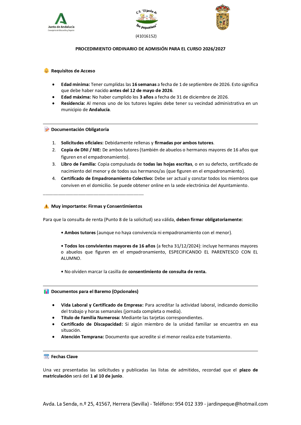 SOLICITUDES DE ADMISIÓN PARA EL CURSO 2026/2027 EN "EL JARDÍN DE LOS PEQUEÑINES"