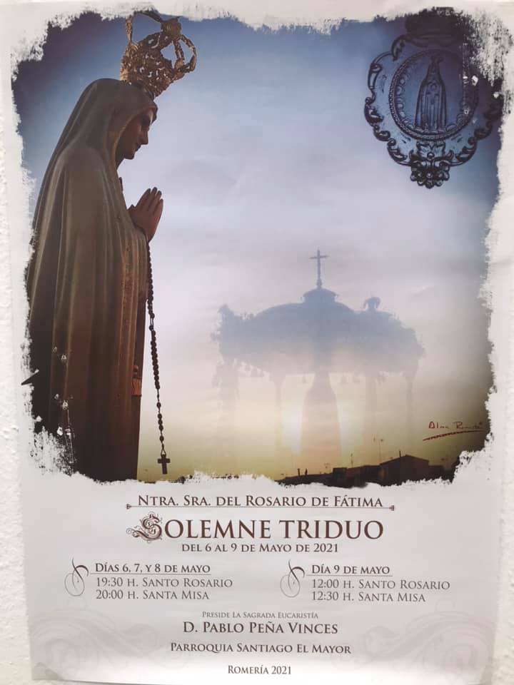 Días 6, 7 y 8 de mayo, 9:30 horas, Santo Rosario, 20 horas, Santa Misa.