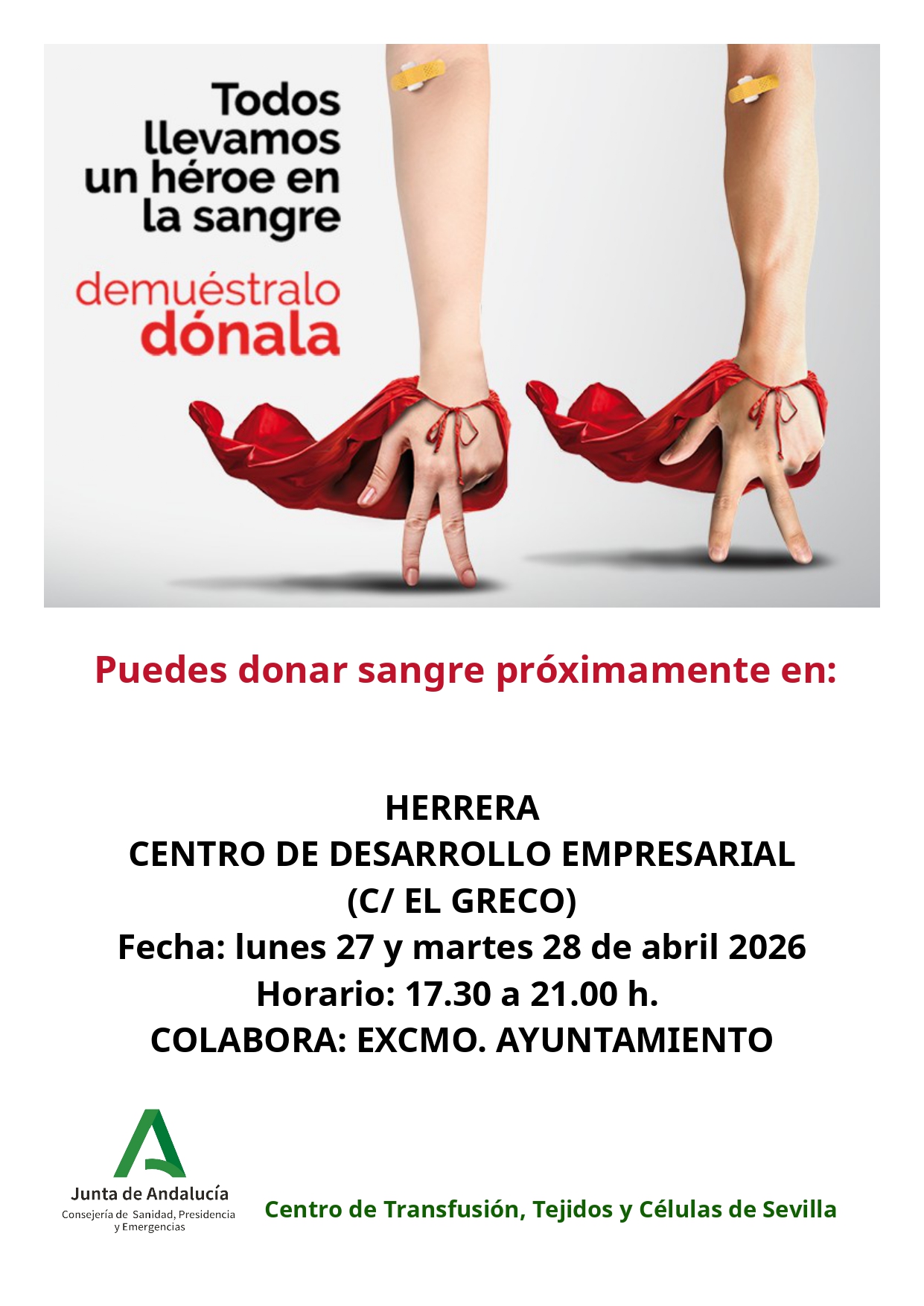 Los herrereños que deseen donar sangre podrán hacerlo el lunes, 27 de abril, y martes, 28 de abril, en horario de 17:30-21:00 horas en el Centro de Desarrollo Empresarial Local, ubicado en calle El Greco s/n.