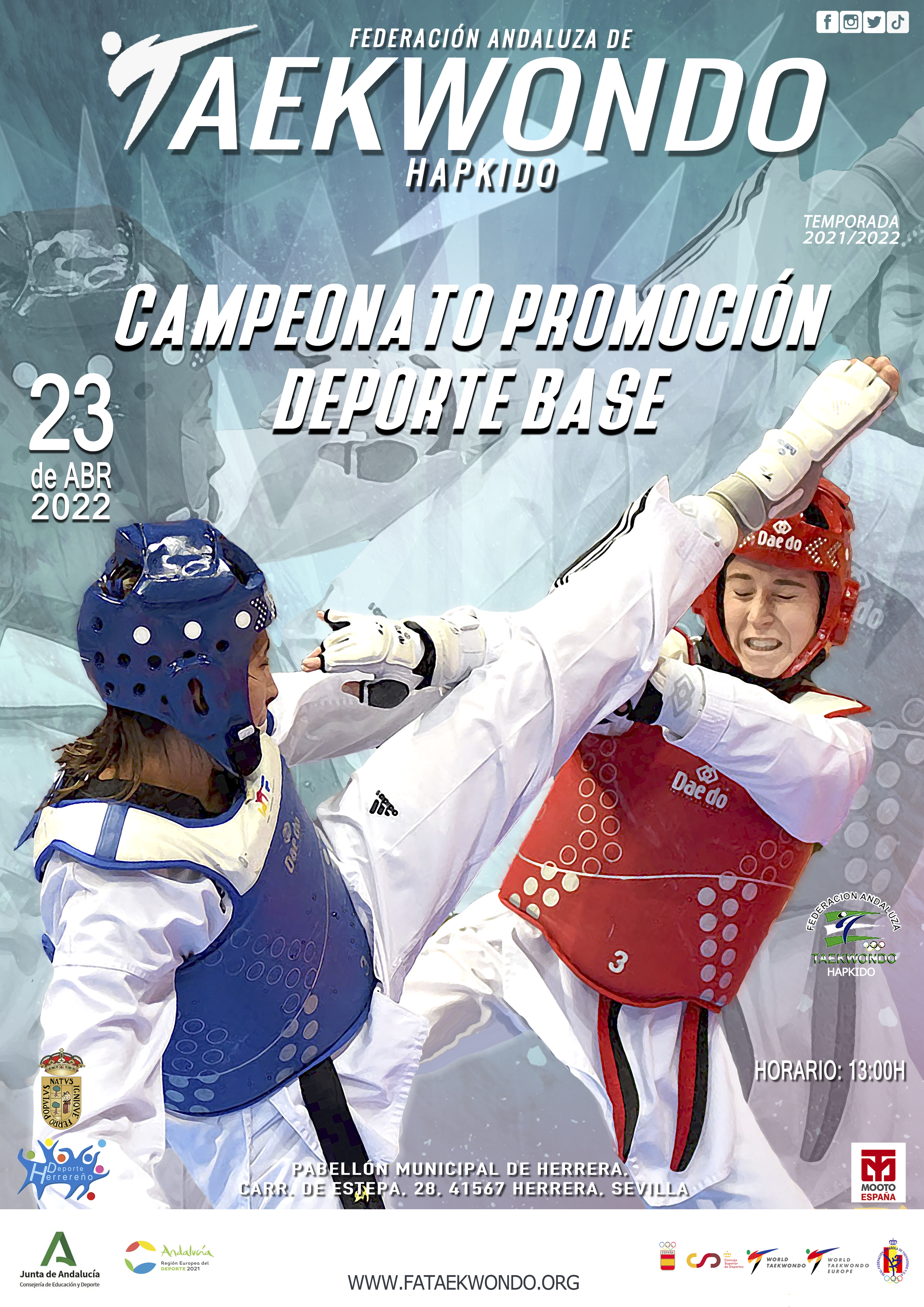 La Federación Andaluza de Taekwondo Hapkido, celebra el próximo sábado en el pabellón municipal de Herrera, el Campeonato Promoción Deporte Base.