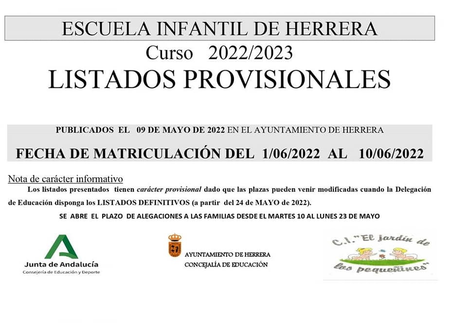 LISTADOS PROVISIONALES ESCUELA INFANTIL 2022/2023