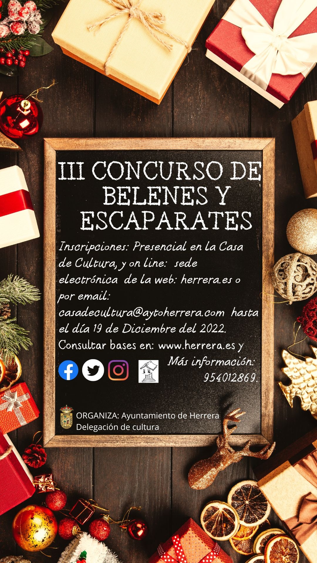 Estimados vecinos y vecinas: Con el encendido del alumbrado, el certamen de villancicos y otras actividades propias de estas fechas, podemos decir, que nuestro pueblo está ya inmerso en la celebración más entrañable del año. Por este motivo, desde el Ayuntamiento compartimos este vídeo que anuncia la Navidad en Herrera. Creo que es una bonita manera de felicitar las fiestas, pero aún más, si lo hacemos llegar a cualquier rincón del planeta, a familiares y amigos a través de las redes sociales, whatspp …