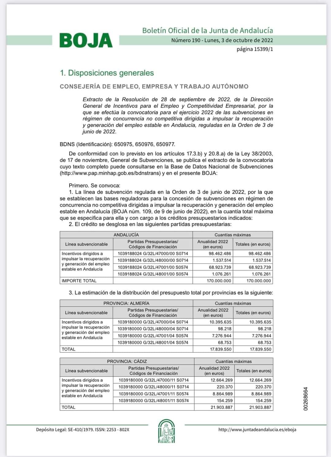 La JUNTA DE ANDALUCÍA ha convocado subvenciones para impulsar la recuperación y generación de empleo estable