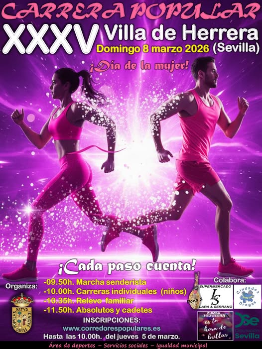 El Ayuntamiento de Herrera informa de la apertura de inscripciones para la XXXV Carrera Popular “Villa de Herrera”, que se celebrará el próximo 8 de marzo de 2026, coincidiendo con el Día Internacional de la Mujer.